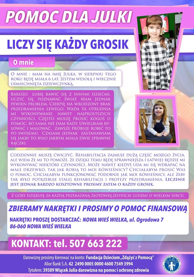 Sześcioletnia Julka z Nowej Wsi Wielkiej potrzebuje pomocy.Rodzice muszą zebrać blisko 80 tys. zł m.in. na zakup protezy, bo dziewczynka urodziła się bez lewego przedramienia.